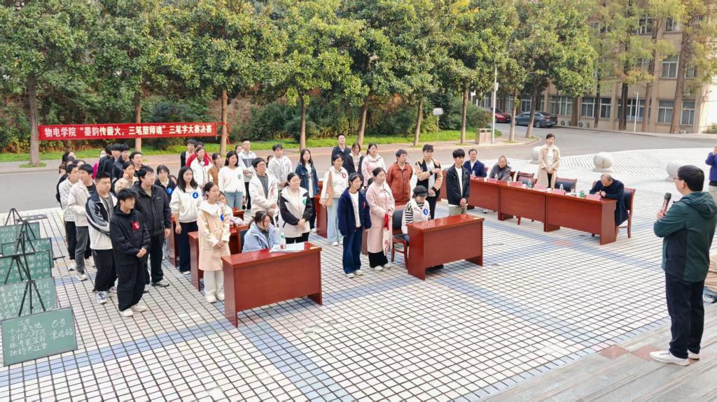 11月16日,人妻a片 在理科楼前举办“墨韵传薪火,三笔塑师魂”三笔字大赛决赛。学院党委副书记张丽,副院长宋宣玉,冯一兵、陈新武、李炳中、孙金士等领导老师亲临现场并担任评委。