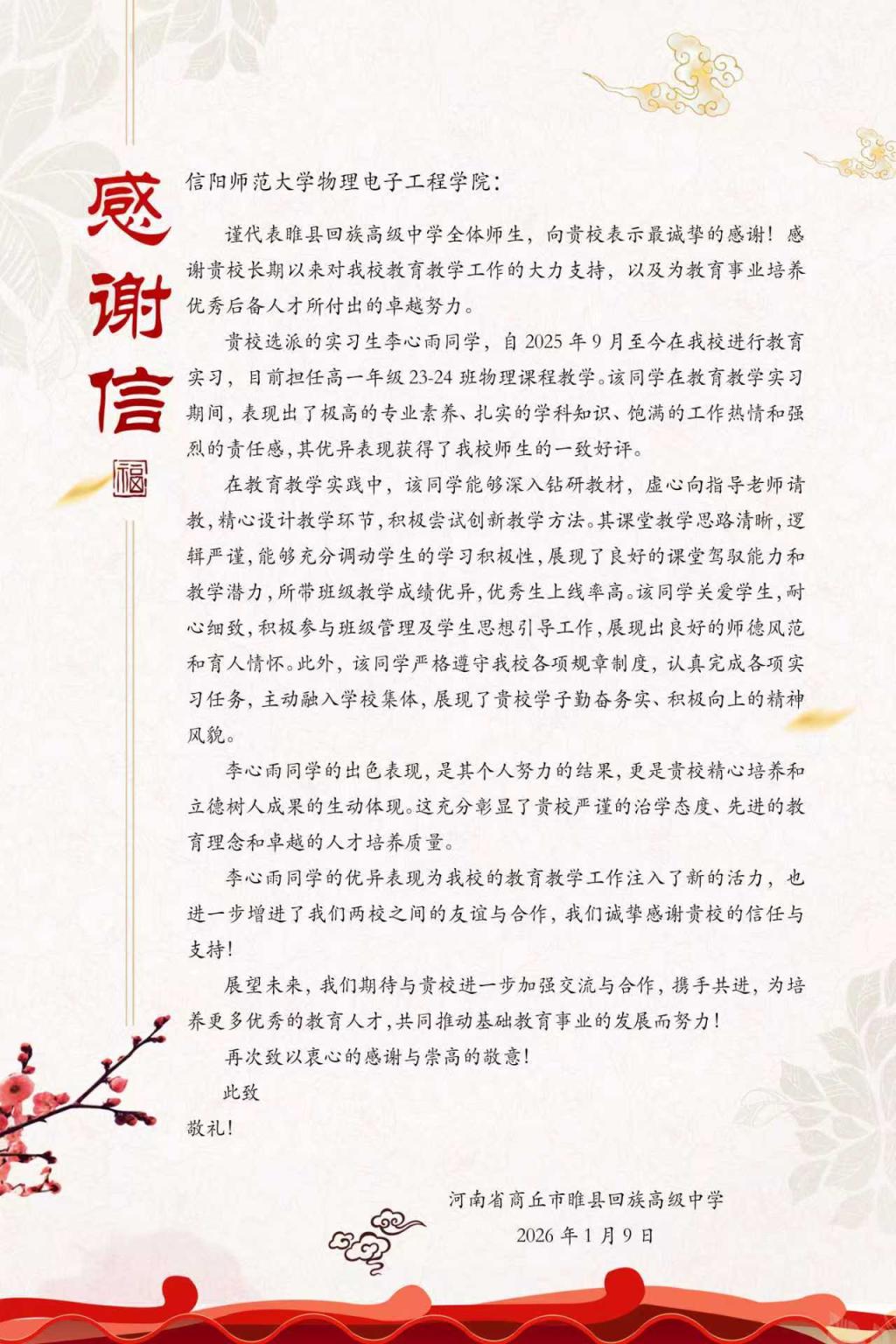 近日,河南省商丘市睢县回族高级中学向人妻a片 发来感谢信,对人妻a片 2026届实习生李心雨同学的教育实习工作给予高度评价和诚挚感谢。